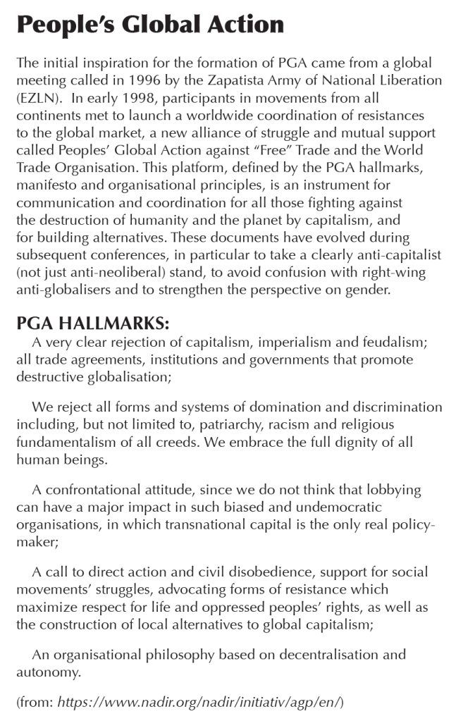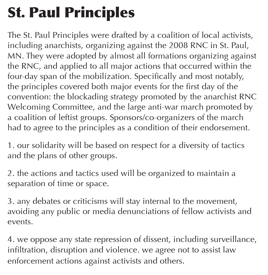 While many organizing collectives, autonomous spaces, actions, mobilizations, camps, conferences, coalitions and more have come up with sets of principles within which they have agreed to operate, there are some that have stood out over time and space and I’m choosing to highlight two here. They are not out of explicitly anarchist groups and, yet, articulate the important impact that anarchist/autonomous/anti-authoritarian politics have had on larger movements. These examples are varied in origin and purpose; time and expected longevity which means that they offer both examples of what it means for an autonomous individual or group to consent to commonly held agreements as well as a glimpse of what strengths global radical movements have shown over recent decades.